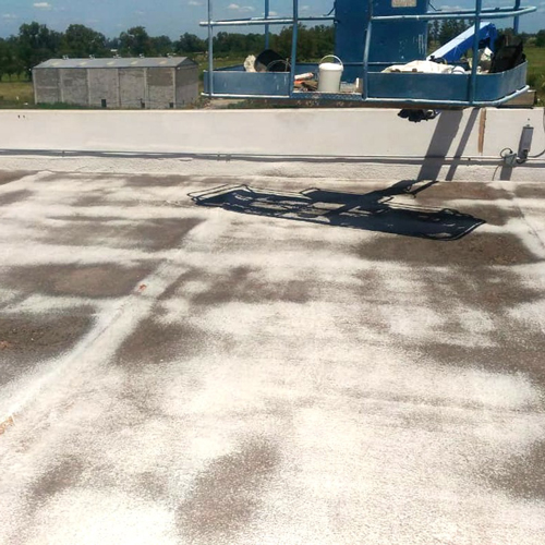 Impermeabilización sobre una superficie de espuma de poliuretano envejecida, con POLIARG PU 100. Se aplicó 1kg de producto por m2. Con esto se logra un techo impermeable por 10 años.